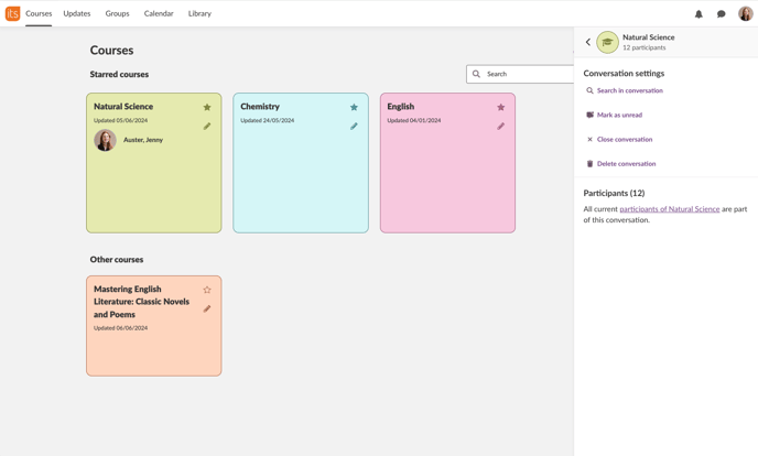 - Lærere og administratorer kan slette elevers beskeder i gruppe- eller kursussamtaler.